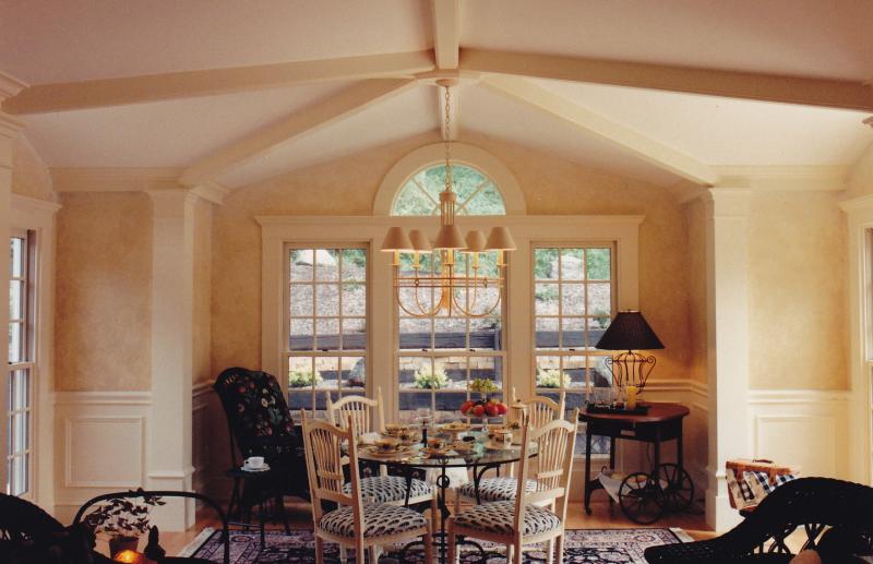 The owners wish for this pool house addition was to provide a warm, sunny room for dining and entertaining. In addition, they desired a room that would be comfortable, light, and afford access and views to their pool. The design is sympathetic to the colonial style of the home and provides a backdrop for the owners antique wicker collection.